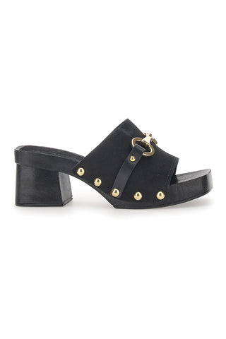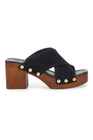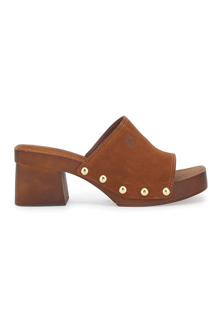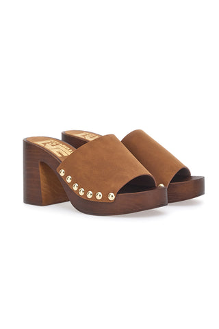 Gilet di montone e shorts in denim, maxi dress con stampa paisley, cavigliere e collanine colorate: al tuo stile boho-chic dell’estate, lo stile ispirato alla cultura hippie e bohemien degli anni ‘60 e ‘70, non puoi che aggiungere uno zoccolo con effetto legno in pelle scamosciata, rigorosamente con borchie e nei toni caldi del marrone. Meglio se con maxi chain sulla tomaia.