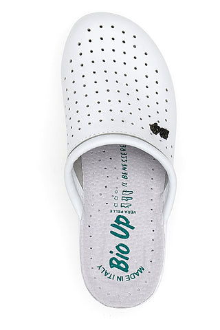 Ciabatta modello clogs Bio Up con tomaia in vera pelle traforata. Sottopiede in vera pelle imbottito che assicura benessere al piede per un uso prolungato durante la giornata. Suola in gomma morbida. Made in Italy.