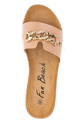 Queste ciabatte presentano un design essenziale che mette in risalto la loro praticità. Il plantare morbido in tessuto garantisce il massimo comfort anche dopo molte ore di utilizzo. Non lasciarti sfuggire il modello più trendy di questa stagione: con queste ciabatte sarai alla moda anche a casa. Impreziosite da una catena che dona luce e unicità, sono ideali per una giornata in spiaggia, una passeggiata al mercato estivo o un aperitivo con gli amici.