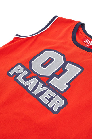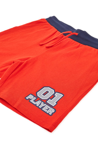 Il tuo bambino si divertirà come non mai a correre e giocare indossando il fresco e comodo completo Pitt Kids composto da canotta e pantaloncini rossi con stampa color grigio e rifiniture blu!