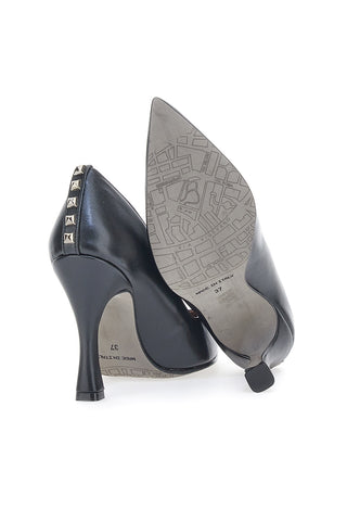 Le décolleté nere dalla punta affusolata, con linee slanciate e pulite, tacco alto, borchie argento, in stile rock e chic. Sono le calzature ideali per serate glamour e cocktail party: comode e versatili, un vero passe-partout per il tuo guardaroba.