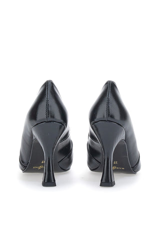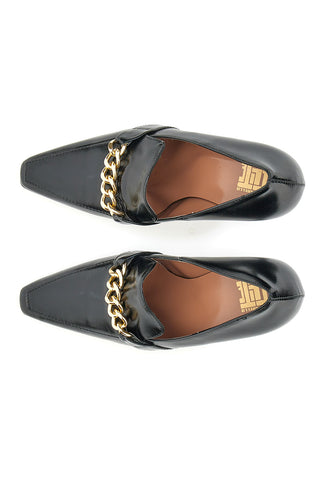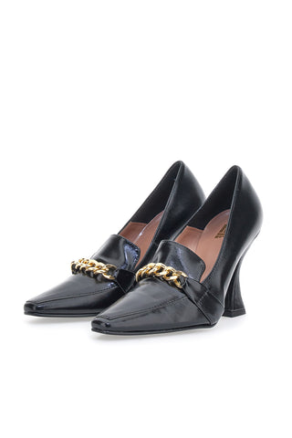 Colpiscono nel segno queste décolleté nere. Punta affusolata, tacco a rocchetto e catenella dorata, questo modello sarà il tuo preferito. Sfoggiale nelle occasioni importanti, non passerai inosservata!