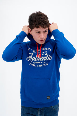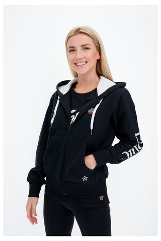 Felpa in cotone felpato nero con bordi a costine, caratterizzata dalla fodera interna del cappuccio in tono fuxia a contrasto. Pratica full zip sul davanti con ampie tasche a marsupio. Logo lettering stampatosempre a contrasto sulla manica sinistra. Bollino gommato “American style” zona cuore